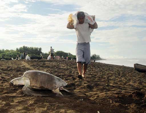 Instead, the turtle egg harvest is an important part of a long-term environmental project developed and managed by the Costa Rican government. The photographs show an egg harvest by villagers at Ostional beach, a remote community near Punta Gurones on Costa Rica's Pacific coast. In 1983, the Costa Rican government created the Ostional Wildlife Refuge in the area and later initiated the Egg Harvest Project (EHP). The EHP allowed villagers to continue their traditional practice of harvesting eggs while furthering the long term goal of assisting in the conservation and recovery of the Olive Ridley turtle species. The harvests are strictly controlled, with villagers only allowed to take eggs within the first day and a half of each egg laying event, known as an "arribada".